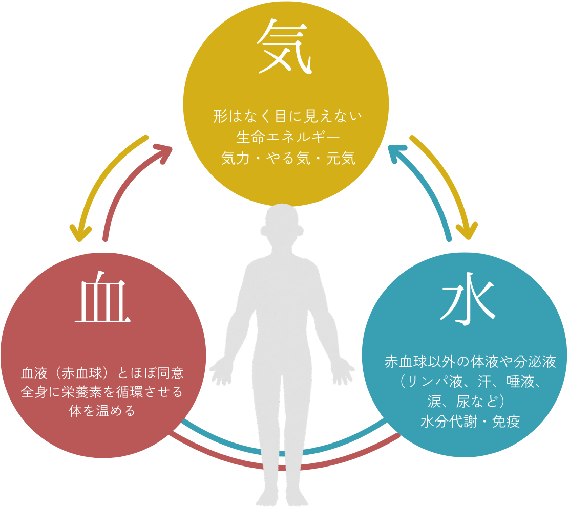 気象の変化による体調不良は、体の「気」「血」「水」のバランスの乱れとして捉え、体質に応じた漢方薬で根本的な改善を目指します。